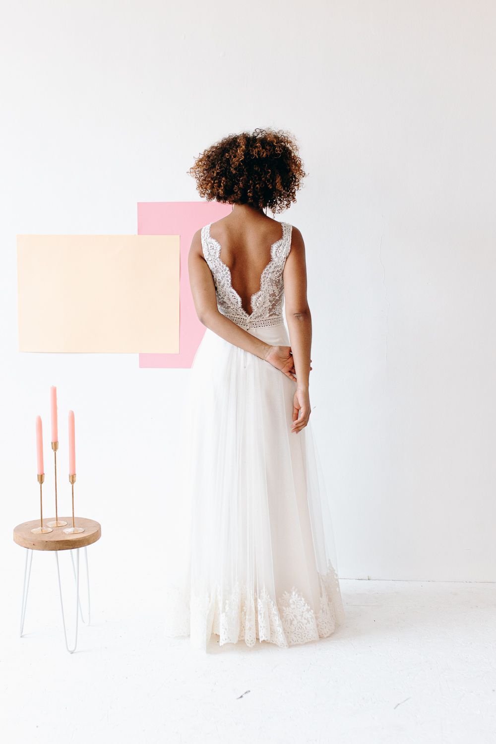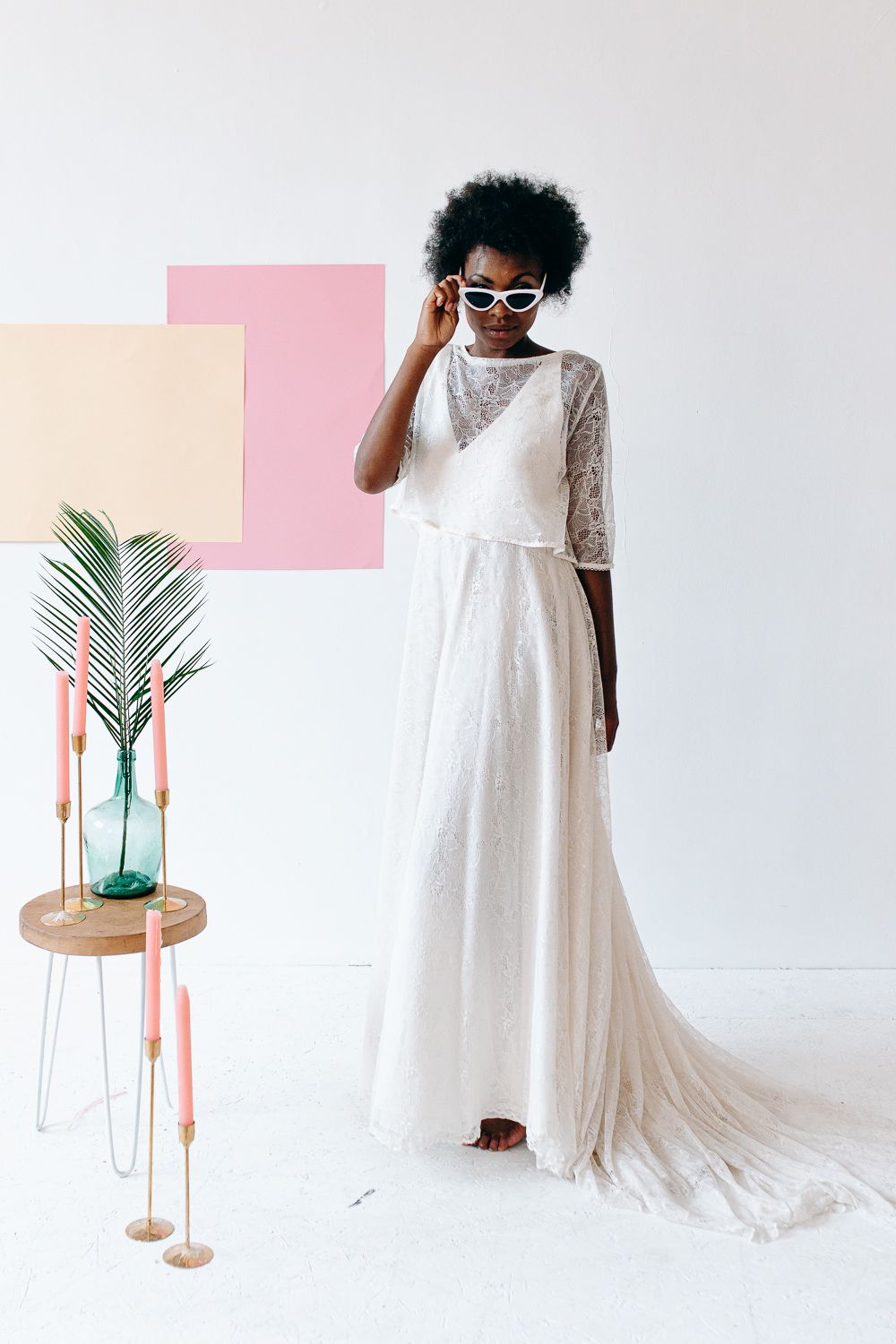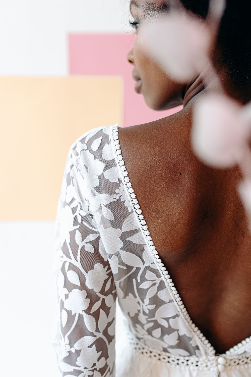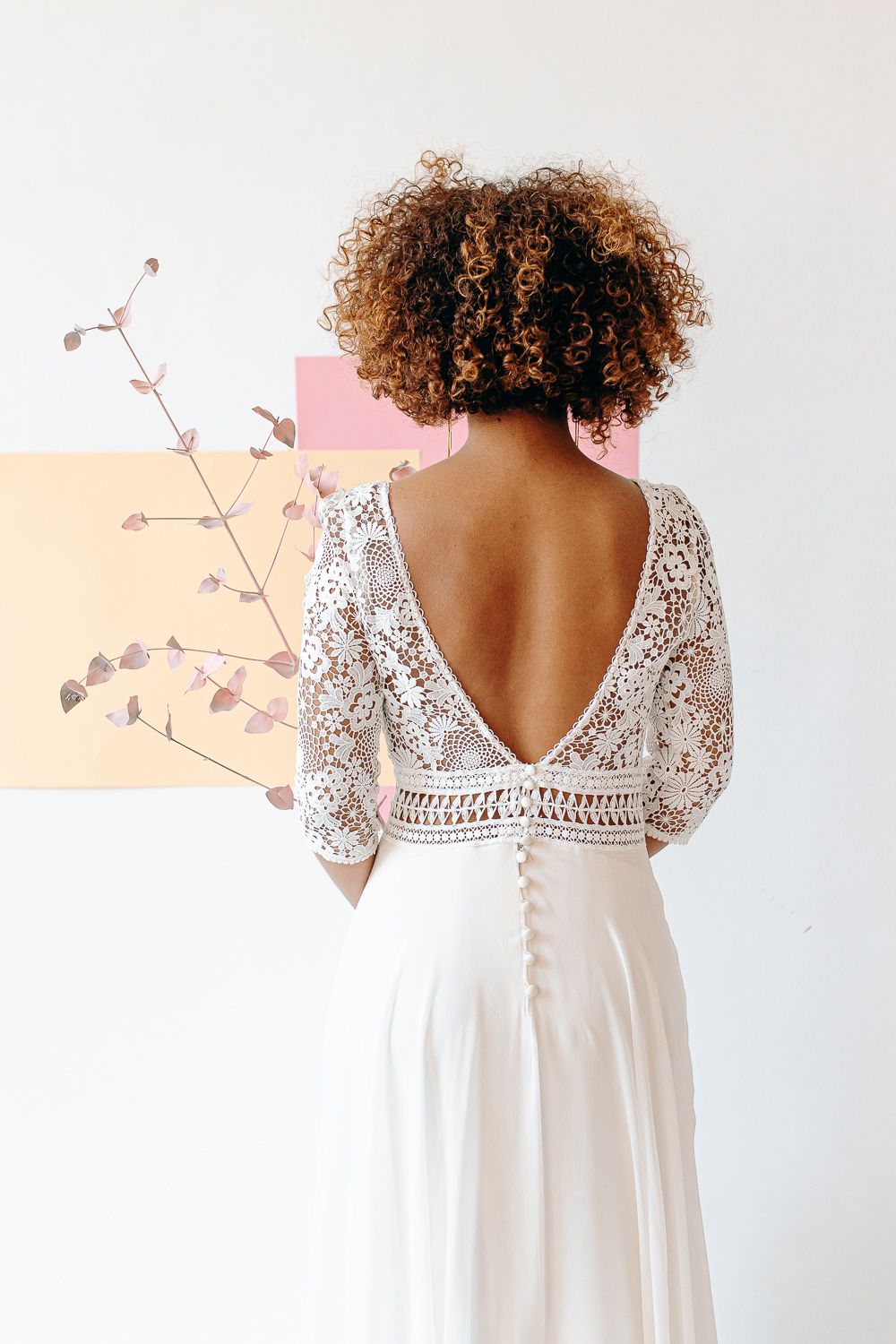 J’ai créé de nouvelles robes de mariée avec de nouvelle matières telles que de la dentelle trois D pour la mariée folk, des tulles brodés pour la romantique, de la guipure pour un air bohème chic et du mikado pour une mariée plus sophistiquée.